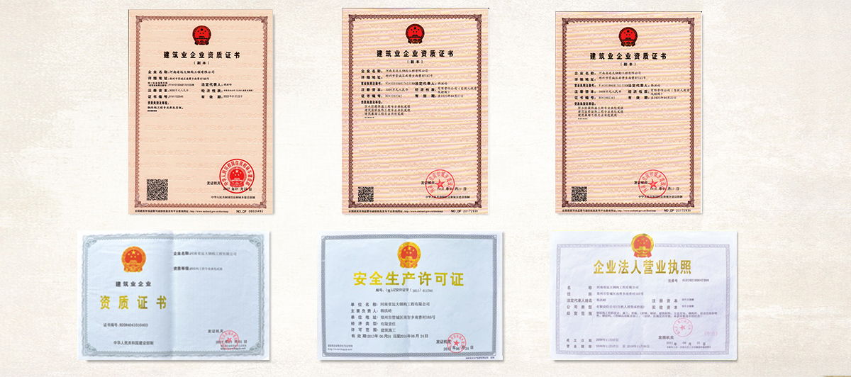 公司擁有“鋼結(jié)構(gòu)制造壹級”和“鋼結(jié)構(gòu)工程專業(yè)承包壹級”專業(yè)資質(zhì),獲得業(yè)內(nèi)認可的各類專利及榮譽資質(zhì)證書;公司及產(chǎn)品已通過了ISO9001質(zhì)量管理體系認證和省級檢測、鑒定,安全耐用。